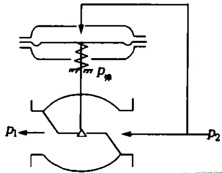 閥前壓力P?經(jīng)過閥芯、閥座的節(jié)流后,變?yōu)殚y后壓力P?。P?經(jīng)過管線輸入上膜室內(nèi)作用在頂盤上,產(chǎn)生的作用力與彈簧的反作用力相平衡,決定了閥芯、閥座的相對位置,控制閥后壓力。當P?增加時,P?作用在頂盤上的作用力也隨之增加。此時,頂盤上的作用力大于彈簧的反作用力,使閥芯關(guān)向閥座的位置。這時,閥芯與閥座之間的流通面積減少,流阻變大,P?降低,直到頂盤上的作用力與彈簧反作用力相平衡為止,從而使P?降為設(shè)定值。同理,當P?降低時。作用方向與上述相反,這就是閥后壓力調(diào)節(jié)的工作原理。
